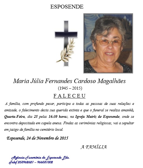 ardente na Igreja Matriz. O funeral ocorrerá no sábado, dia 29, pelas 9h 30. O